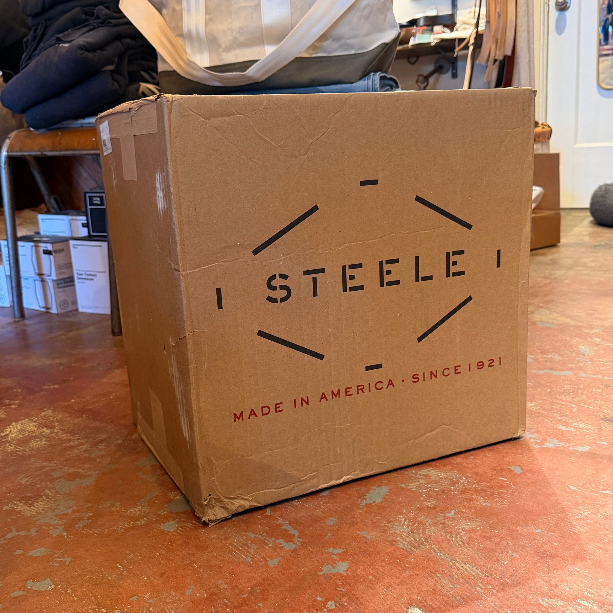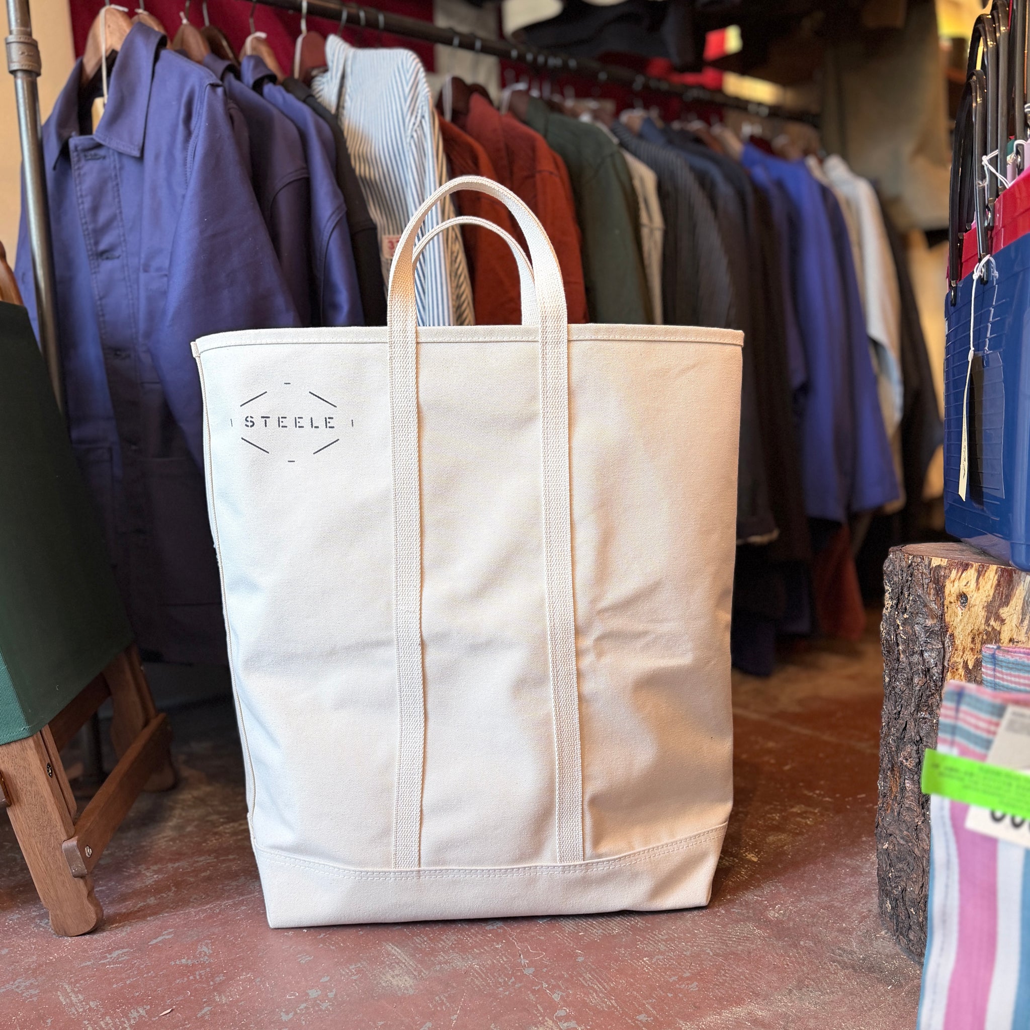 Heavy canvas “coal” bag. Coal bags originated in the 19th and early 20th centuries as heavy-duty, reinforced canvas totes used to transport coal for heating, particularly during the Industrial Revolution. Made by STEELE in the USA.